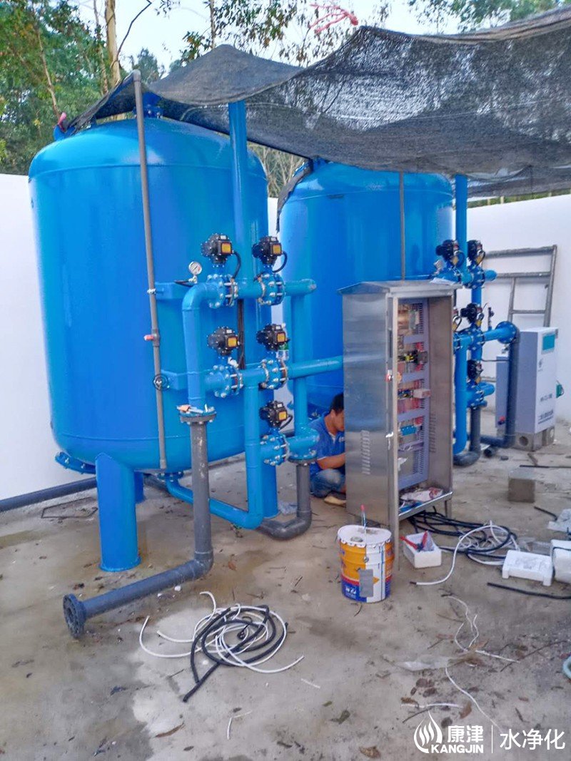 設備是壓力式的,其原理是當原水自上而下通過濾料時,水中懸浮物由于吸附和機械阻流作用被濾層表面截留下來;當水流進濾層中間時,由于濾料層中的砂粒排列的更緊密,使水中微粒有更多的機會與砂粒碰撞,于是水中凝絮物、懸浮物和砂粒表面相互粘附,水中雜質截留在濾料層中,從而得到澄清的水質。經過濾后的出水懸浮物可在3毫克/升以下。