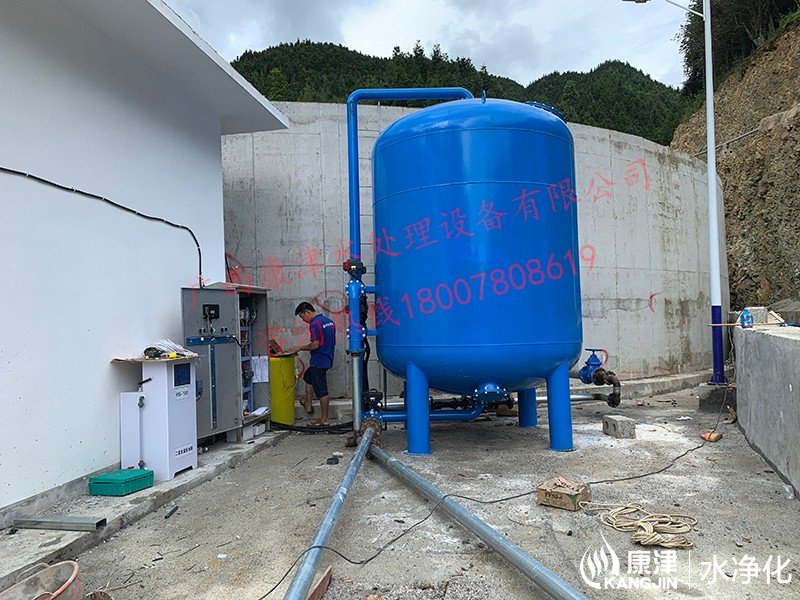 工藝流程:山泉水-絮凝投加器-石英砂過濾器-二氧化氯加藥器-用水點