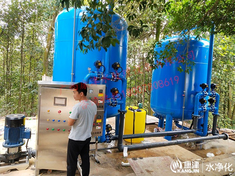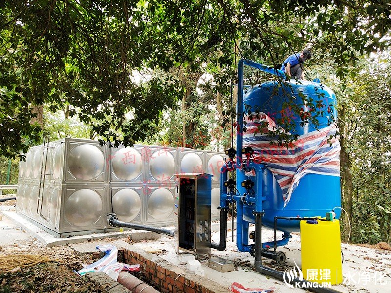 工藝流程:湖水-水箱曝氣消毒-絮凝加藥-石英砂過濾器-活性炭過濾器-精密過濾器-二氧化氯加藥器-凈水池-各用水點