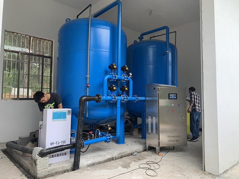 采用化學反應,自動緩釋延時壓力加氯工藝,以含氯75%以上的固體藥劑為主要原料,水與藥劑合理混合后產生的消毒殺菌液,投加到水池、水井、管道和污水池與之接觸達到滅菌的作用。